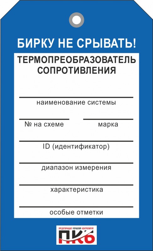 Информационная бирка "Термопреобразователь сопротивления". Изготовлена из пластика ПВХ, толщиной 0,3 мм, без ламинации, диаметр отверстия 7 мм. По желанию заказчика толщина бирки может быть увеличена до 1-2 мм. Нанесение текста необходимо производить маркером или шариковой ручкой. Размер 70 х 115 х 0,3 мм.