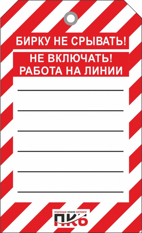 Информационная бирка "Не включать, работа на линии" арт. PKBS100, для одноразового использования, односторонняя. Изготовлена из пластика, толщиной 0,3 мм, оснащена металлическим люверсом Ø 8 мм . По желании заказчика толщина бирки может быть увеличена до 1-2 мм. Нанесение текста можно производить маркером или ручкой. Размер 70 х 115 х 0,3мм.