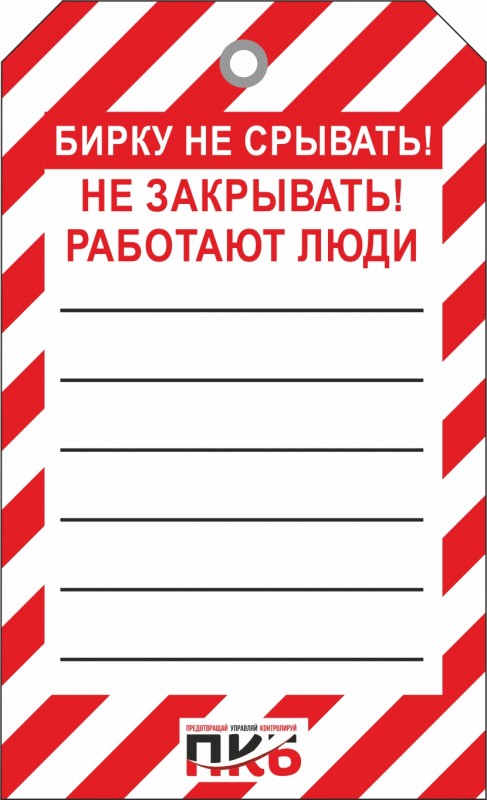 Информационная бирка "Не закрывать, работают люди", арт. PKBS101, для одноразового использования, односторонняя. Изготовлена из пластика, толщиной 0,3 мм, оснащена металлическим люверсом Ø 8 мм . По желании заказчика толщина бирки может быть увеличена до 1-2 мм. Нанесение текста можно производить маркером или ручкой. Размер 70 х 115 х 0,3мм.